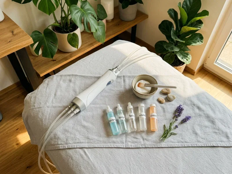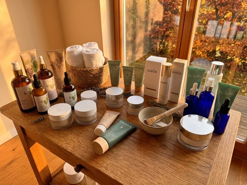 Achte darauf, mit welchen Wirkstoff-Linien gearbeitet wird — Babor, Maria Galland, Dr. Spiller, Vinoble oder Caudalie sind verbreitet. Die Marke gibt dir einen Hinweis auf Qualität und Anwendungsspektrum.