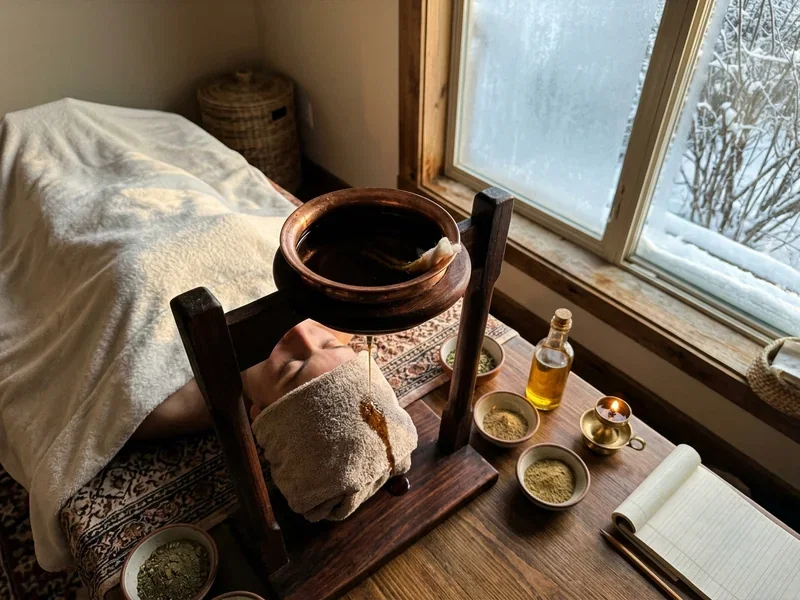 Plane vor der Anwendung keinen Sport und kein schweres Essen ein. Komm mit gewaschenen Haaren, das Öl bleibt nach der Behandlung mindestens eine Stunde im Haar — viele Häuser empfehlen, es bis zum nächsten Morgen wirken zu lassen. Nach Shirodhara ist Ruhe wichtig: nicht direkt ins Auto, kein Bildschirm, kein lautes Programm. Trinke warmes Wasser, lege dich für 30 Minuten hin. Die Wirkung entfaltet sich oft erst Stunden später.
