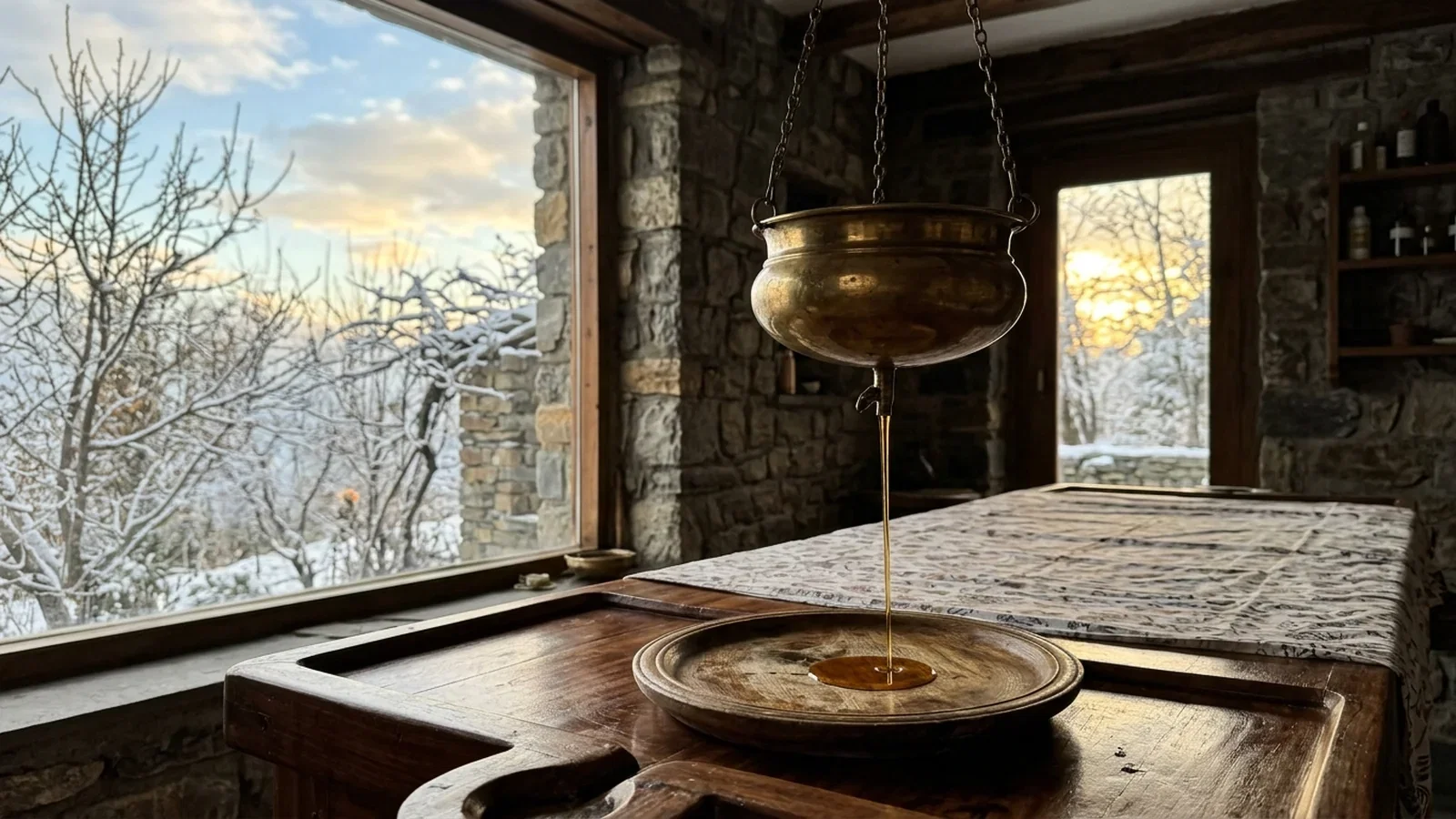 Shirodhara ist eine der bekanntesten Anwendungen aus dem klassischen Ayurveda. Der Name kommt aus dem Sanskrit: shiro bedeutet Kopf, dhara heißt Strom. Genau das passiert auch — über einem speziellen Tongefäß oder Kupferkessel fließt 30 bis 40 Minuten lang ein dünner, warmer Ölstrahl auf die Stirn. Gezielt auf die Stelle zwischen den Augenbrauen, in der ayurvedischen Tradition als drittes Auge oder Marma-Punkt bezeichnet.
