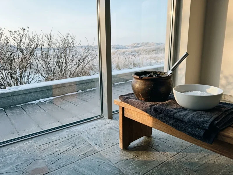 Das Wort kommt aus dem Griechischen: thálassa heißt Meer. Und genau das ist der Kern — Thalasso nutzt ausschließlich, was die See liefert. Die vier klassischen Grundelemente sind Meerwasser (warm, direkt aus der Nordsee oder Ostsee ins Badehaus gepumpt), Algen (meist braune Makroalgen wie Fucus vesiculosus für Packungen), Meeresschlick oder Sand (für warme Bodypacks und Peelings) und das Klima selbst: Seeluft, Sonne, Wind, Bewegung am Strand. Nur wenn alle vier zusammenkommen, heißt es Thalasso.