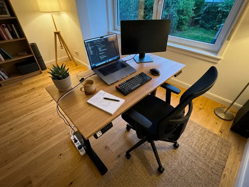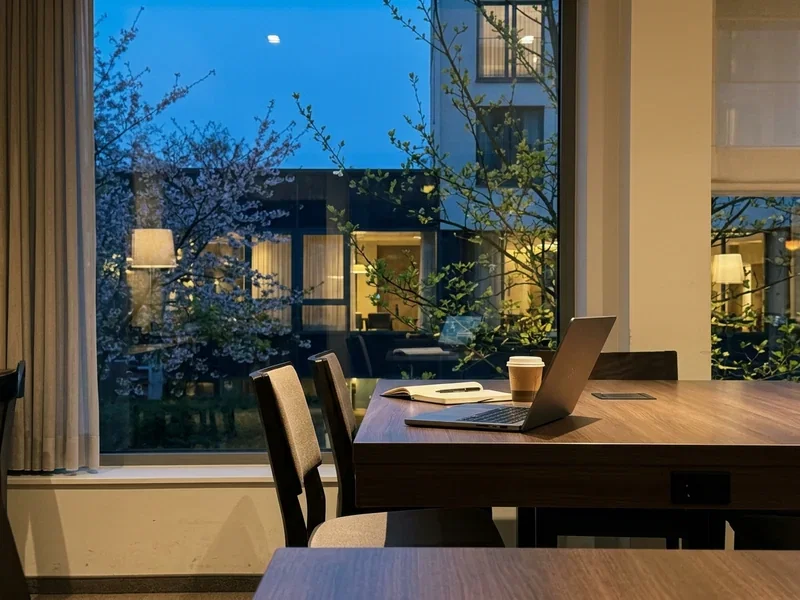 Schreibtisch im Zimmer mit ergonomischem Stuhl, Steckdose in Reichweite, gutes Licht. Kein Frühstückstisch mit Hotelstuhl. Im Idealfall plus Co-Working-Bereich für Calls und Deep-Work-Sessions.