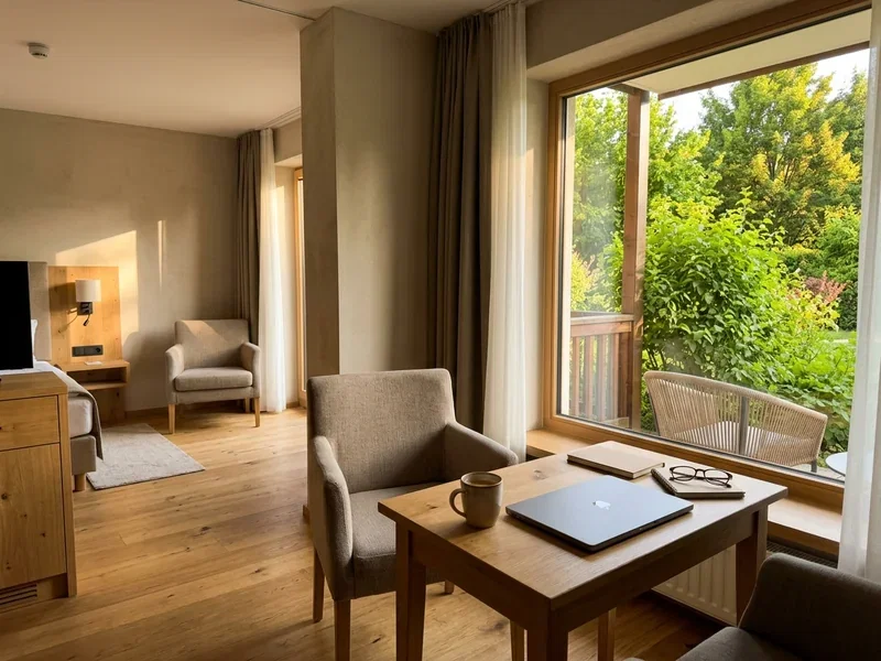 Bleisure ist die Verschmelzung von Business und Leisure: Du verlängerst eine Geschäftsreise um Erholungstage oder erledigst die Arbeitswoche aus einem Wellness-Hotel heraus. Seit der Pandemie ist das Modell breiter akzeptiert — viele Häuser haben Co-Working-Bereiche, schnelles WLAN und ruhige Arbeitsplätze nachgerüstet. Der Spa wird zum Feierabend, nicht zum Programm.
