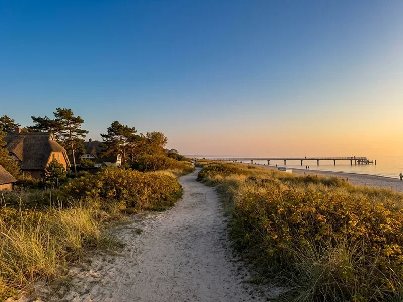 Zingst zwischen Meer und Boddengewässern — die ruhigste Ecke der Halbinsel. Grosse Wellnesshotels mit Thalasso-Tradition, Kranichbeobachtung im Herbst, Yoga am Strand. Für stille Tage abseits jedes Trubels.