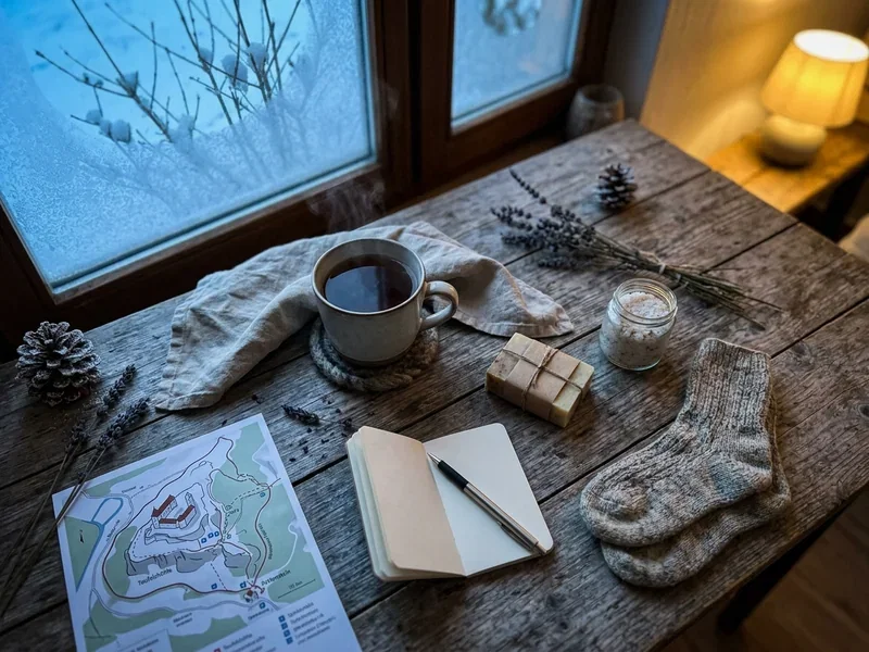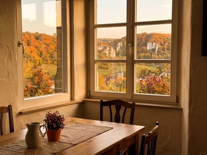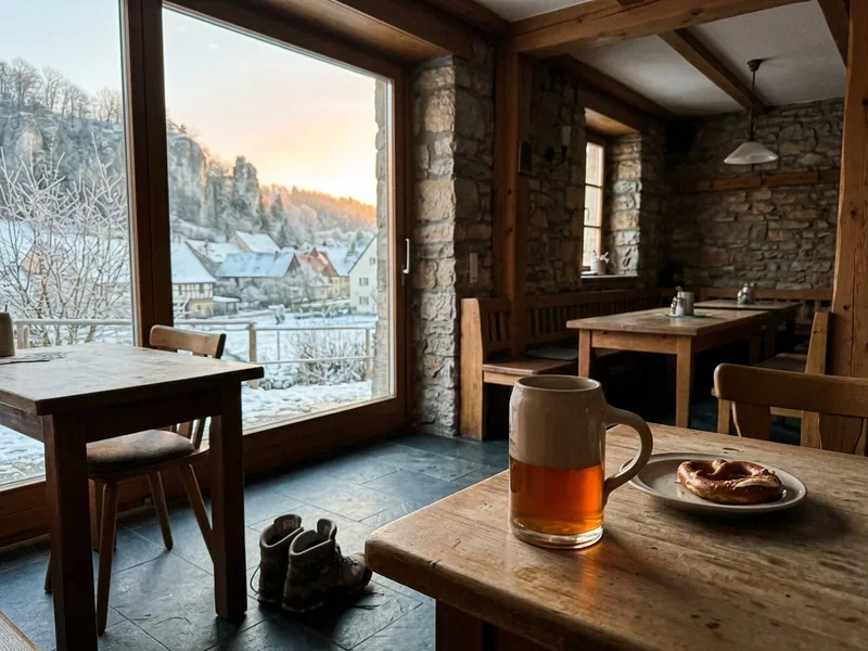 Mittags ein Brauereigasthof mit Schäuferla und Kellerbier — die Schäuferla, geschmortes Schweineschulterstück mit knuspriger Kruste, ist die Signatur-Speise der Region. Am Nachmittag eine kurze Wanderung zu einem der Aussichtspunkte, am späten Nachmittag in die Sauna. Wenn dein Hotel eine Außenterrasse Richtung Tal hat, ist das der Moment, an den du dich erinnern wirst.