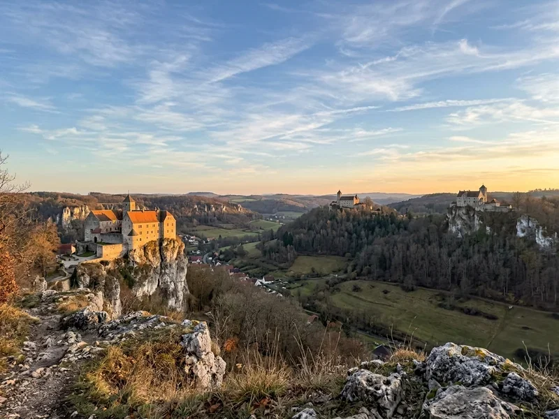 Pottenstein, Gößweinstein, Egloffstein — drei Burgen in Sichtweite, jede auf einem eigenen Felsen. Wer den Hof von Pottenstein im Abendlicht sieht, versteht, warum diese Region die Romantiker des 19. Jahrhunderts begeistert hat.
