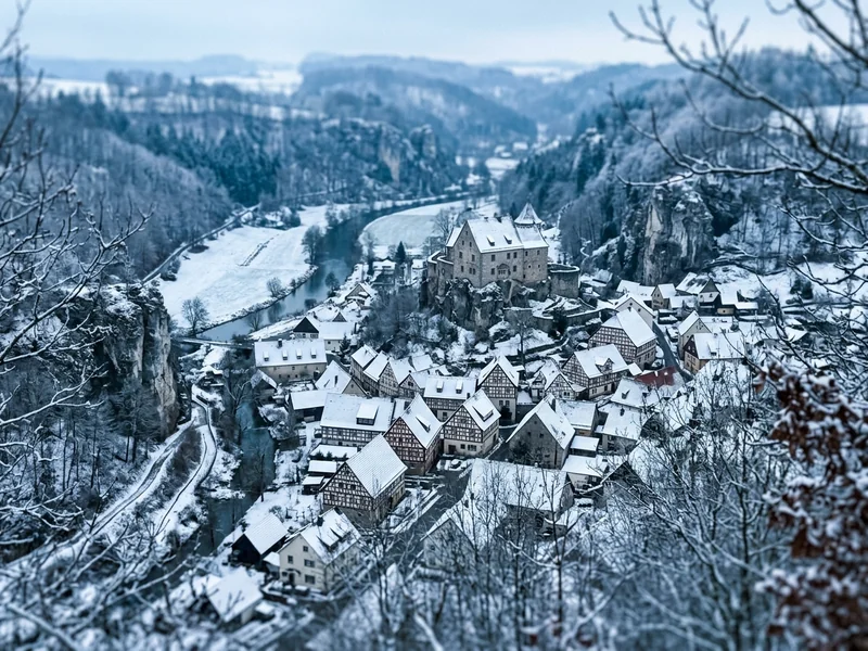 Die Fränkische Schweiz liegt in Oberfranken, zwischen Bamberg, Bayreuth und Nürnberg — geologisch ist sie ein Karstgebirge aus Jurakalk. Über Jahrmillionen hat das Wasser den Stein ausgehöhlt: Heute steht die Region für helle Felsen, tiefe Trockentäler und mehr als tausend Höhlen, viele davon kaum erforscht. Die Wiesent schlängelt sich als Hauptfluss durch das Tal, und an den Felskanten sitzen Burgen wie Pottenstein, Gößweinstein und Egloffstein, als hätte sie jemand für eine Buchillustration platziert.