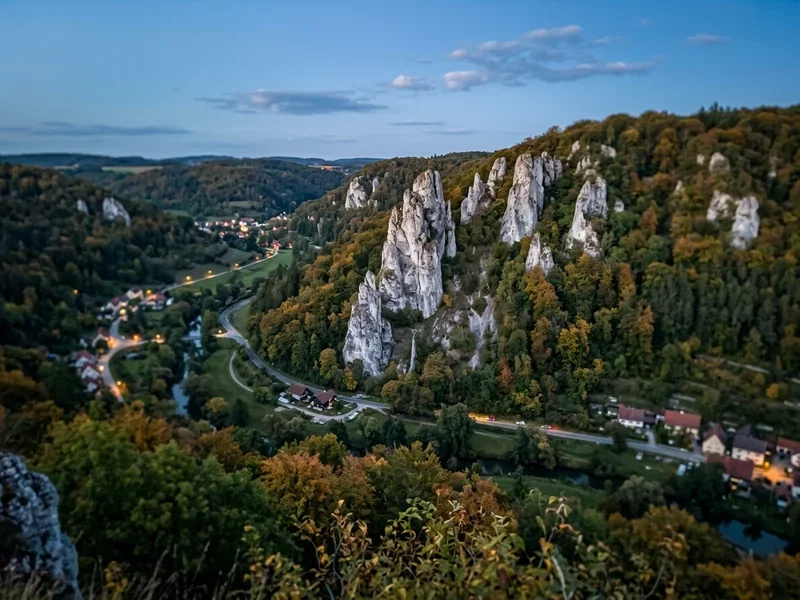 Anders als Bayerischer Wald oder Fichtelgebirge ist die Fränkische Schweiz aus hellem Jurakalk geformt. Die Felsnadeln über dem Wiesent-Tal gehören zu den ältesten Klettergebieten Bayerns — und prägen jeden Blick aus dem Hotelfenster.