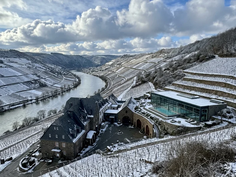 Flusslandschaft mit Burgen, Steilhängen und Rieslinggütern. Hotels in Bernkastel-Kues, Traben-Trarbach oder Cochem. Abendlicht auf dem Fluss, Weinprobe am Nachmittag, Sauna mit Blick. Sehr fotogen — die Wochenenden-Fotos gelingen hier von allein.