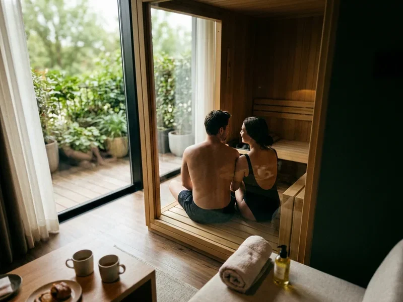Die wirklich guten Häuser bieten Dinge, die sich als Paar besonders anfühlen: eine Side-by-Side-Paar-Massage, bei der man nebeneinander liegt statt in getrennten Kabinen. Eine Privat-Sauna im Zimmer oder in der Suite — oft aus massivem Vollholz, mit eigener Zeitsteuerung. Ein Whirlpool oder eine freistehende Badewanne mit Blick. Und gelegentlich die Möglichkeit, das Dinner aufs Zimmer oder auf die Terrasse zu bestellen, ohne dass es nach Servicefall klingt.
