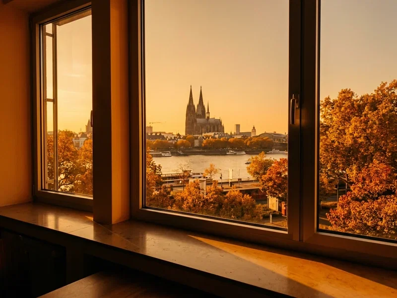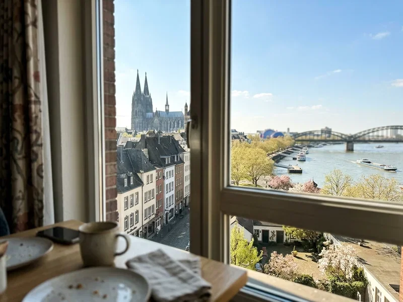 Rechtsrheinisch, fünf Minuten über die Hohenzollernbrücke in die Altstadt. Domblick aus den oberen Etagen, Rheinpark und Claudius Therme direkt vor der Tür. Beste Wahl, wenn die Therme im Mittelpunkt deines Wochenendes stehen soll.