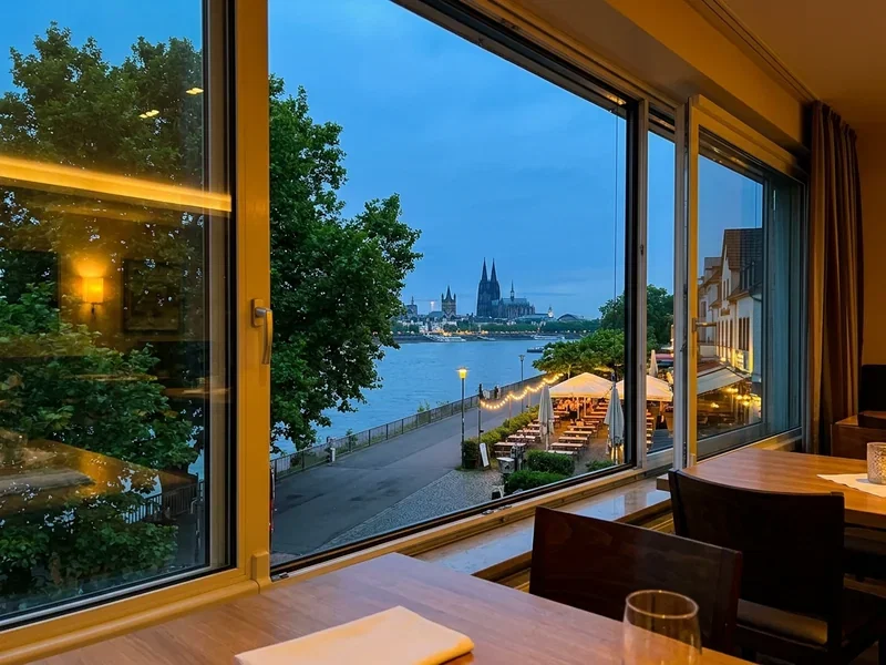 Hotels direkt am Wasser — in Rodenkirchen mit Blick auf den Strom und das Siebengebirge am Horizont, in Deutz mit Domblick aus den oberen Etagen. Etwas distanzierter zur Innenstadt, dafür mit Rheinpromenade vor der Tür und kurzer Strecke zur Claudius Therme.