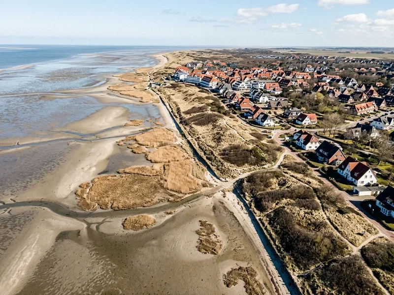 Nordseeort mit den berühmten Pfahlbauten und einem extrem breiten Strand. Die Dünen-Therme bietet Meerblick, einzelne Häuser haben Strandsauna. Rauer Charme, UNESCO-Wattenmeer direkt vor der Tür.